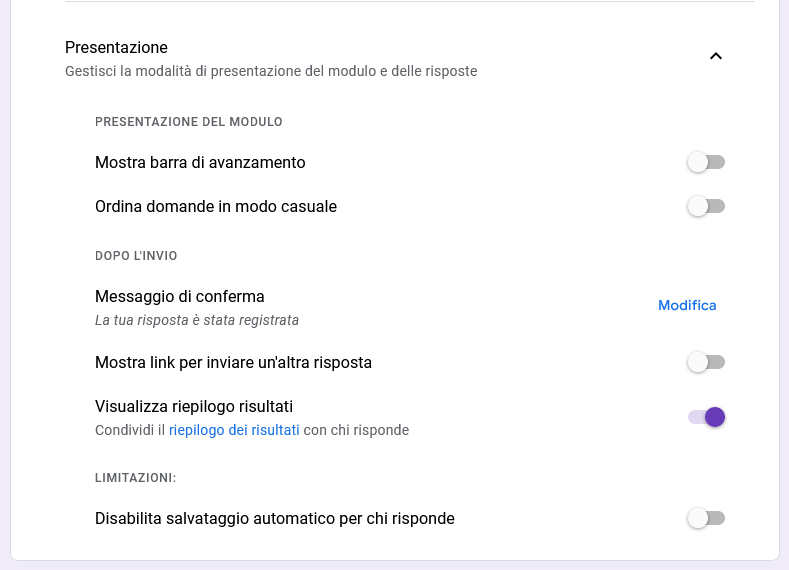 Per farlo, dalle impostazioni del modulo dovrai selezionare l'impostazione Visualizza riepilogo risultati, che ti permetterà di aprire una pagina con il riepilogo delle risposte accessibile a tutti e il cui link potrai condividere: